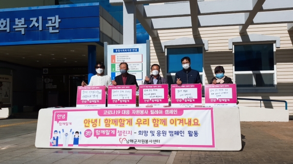 [국회의정저널] 남해군자원봉사센터는 8일 종합사회복지관 앞에서 남해군자원봉사단체 협의회의 참여로 코로나19 대응 자원봉사 릴레이 캠페인 제3탄 ‘우리 함께해요’ SNS 챌린지의 시작을 알렸다.