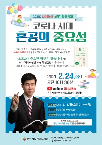 [국회의정저널] 순천 신대도서관이 오는 24일 ‘초3보다 중요한 학년은 없습니다’저자 해피이선생의 신학기 맞이 특강 ‘코로나 시대 혼공의 중요성’을 운영한다.
