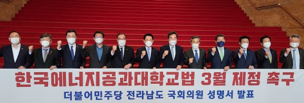 김 지사는 또 이날 더불어민주당 전남도당과의 당정협의회에서 특별법 제정을 건의하고 이어 전남지역 국회의원 10명이 한국에너지공과대학교법 3월 제정을 촉구하는 성명서 발표에도 함께 참여했다.