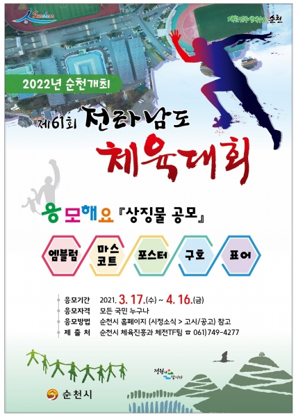 [국회의정저널] 순천시는 2022년 4월 순천에서 열리는 제61회 전라남도체육대회의 성공적인 개최를 기원하고 200만 전남도민의 상생과 화합을 도모할 상징물을 공모한다.