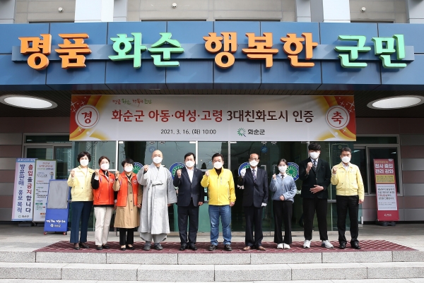 구충곤 화순군수는 “3대 친화도시 인증을 계기로 보편복지 정책을 확대하고 주민 체감도 높은 시책을 적극적으로 발굴, 추진하겠다”며 “그동안 추진해 온 3대 친화도시 조성 사업을 점검하고 더욱더 촘촘한 사회 안전망을 구축해 따뜻한 복지공동체를 만들겠다”고 밝혔다.