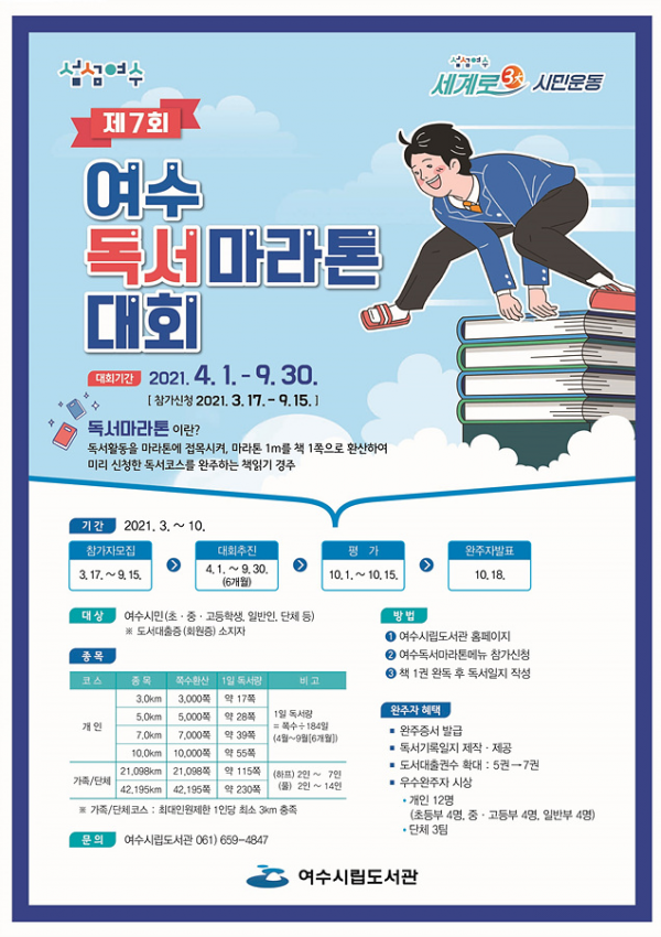 여수시(시장 권오봉)가 시민들의 독서생활화와 책 읽는 독서문화 공동체 형성을 위해 제7회 여수독서마라톤대회를 개최한다.