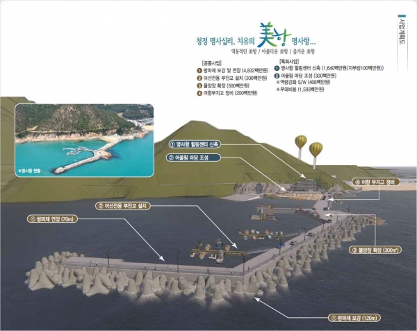 신지 명사항에는 부잔교 설치, 명사항 관리센터 조성 등 어항시설 정비 사업과 물놀이 어항 공간, 재활용 예술 공원, 주민 치유센터 조성 등 주민생활 여건 개선 사업도 추진할 계획이라고 전했다.