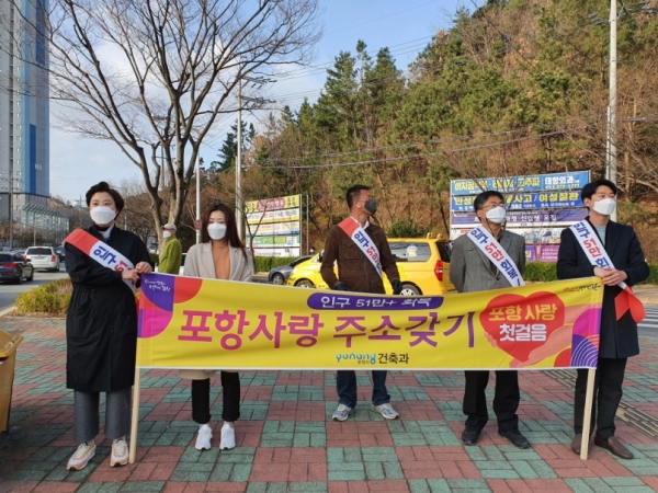 포항시는 저출산·경기침체 등으로 인한 지속적인 인구감소로 50만 인구가 붕괴될 위기에 놓여있어, 올해 역점시책 사업인 ‘인구 50만 사수 51만 회복’을 위한 포항사랑 주소 갖기 운동을 대대적으로 펼치기 위해 캠페인을 시작했다.