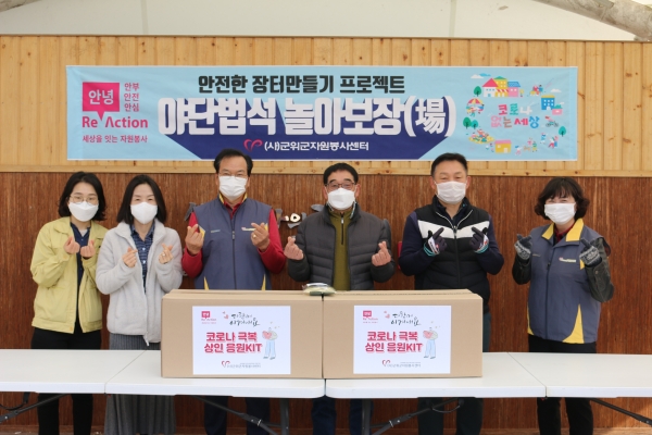 이와 더불어 코로나로 인해 힘들어하는 상가에 응원키트 및 마스크 착용 안내 포스터를 배부·부착하는 자원봉사활동을 진행했고 군위시장 상인회에도 코로나응원키트를 전달했다.