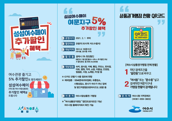 시에 따르면 관광객이 여문지구 내 여수사랑상품권가맹점에서 ‘섬섬여수페이’ 결제 시 월 최대 25,000까지 결제금액의 5%를 현장할인 받을 수 있다.