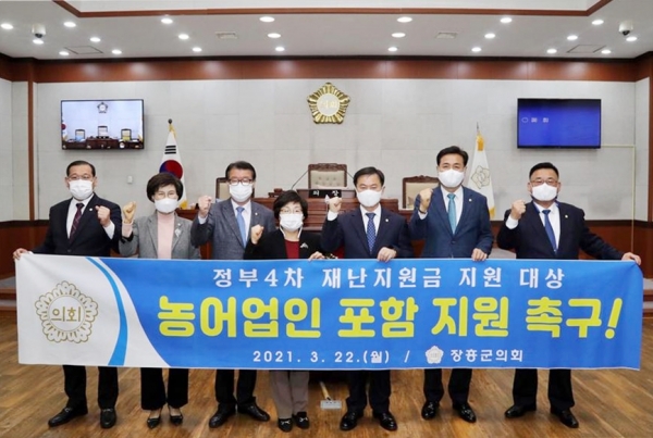 장흥군의회는 “정부가 코로나19와 기후 위기 속에서 여전히 농어촌에 대한 지원에는 인색하기만 하고 농어촌에 대해서 눈과 귀를 돌리고 있는 것에 농어업인들이 느끼는 상실감은 이루 말할 수 없다”며 “제4차 재난지원금 지원을 위한 추경안을 제출한 정부와 이를 심의 중인 국회가 코로나19로 인한 피해 농어업인들의 호소에 답해 주기를 바란다”고 전했다.