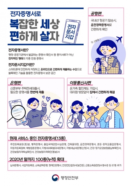 전자증명서·전자문서 지갑 시스템은 행정안전부가 2019년부터 디지털정부 혁신사업의 하나로 추진해 현재까지 주민등록 등·초본 등 100종의 민원서비스를 제공토록 구축됐으며 2021년까지 300종으로 확대 운영할 전망이다.