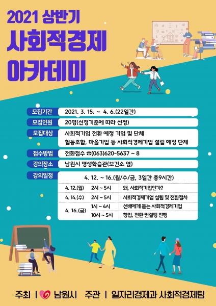 사회적경제아카데미 교육생 모집은 4월 6일까지, 사회적경제 컨설팅 참가자 모집은 4월 9일까지 남원시 사회적경제팀을 통해 진행된다.