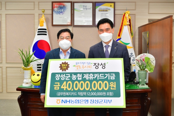 23일 군은 유두석 장성군수와 조상명 NH농협 장성군지부장 등이 참석한 가운데 ‘장성군 법인카드 등 포인트 적립금 전달식’을 가졌다.