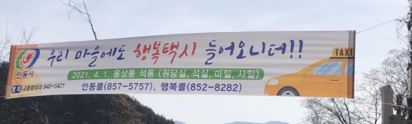 안동시가 운행 중인 행복택시는 오·벽지 마을 주민들의 이동권을 보장하고 교통복지의 증진을 위해 지난 2017년부터 도입된 제도로 현재까지 16개 읍·면·동 126개 마을까지 확대운행을 했으며 이용 주민이 연간 2만8천명이 넘을 정도로 주민들의 큰 호응을 얻고 있다.