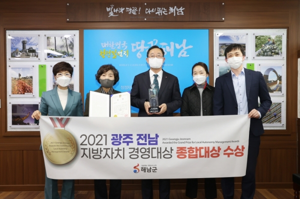 해남군은 조직구성원의 능동적인 정책개발 기반을 바탕으로 창의·혁신 행정전략을 구축해 군민의 삶을 아우르는 다양한 분야에서 괄목할 만한 성과를 이뤄내면서 종합 대상의 영예를 안았다.