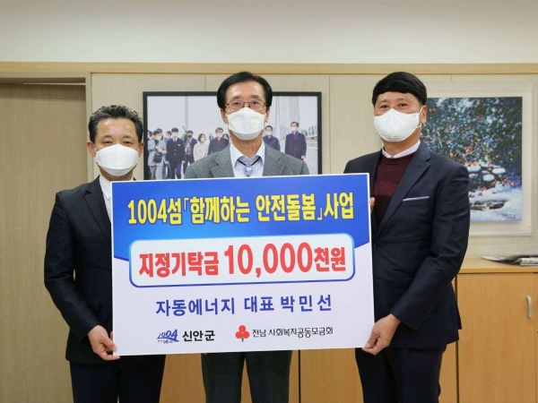 [국회의정저널] 신안군은 지난 26일 자동에너지으로부터 신안군 취약계층 주민들을 위한 사업비 1천만원을 전남사회복지공동모금회를 통해 지정기탁 받았다고 전했다.