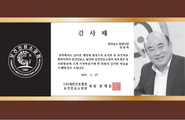 [국회의정저널] 광양시는 지난 27일 정현복 광양시장이 제37회 보건진료소장회 정기 대의원 총회에서 지방자치단체장으로서는 전남 최초로 감사패를 수상했다고 밝혔다.
