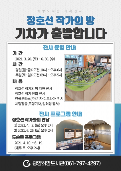 [국회의정저널] 광양희망도서관이 도서관 꿈싹갤러리에서 오는 6월 말까지 3개월간 정호선 그림책 작가와 함께하는 작가의 방 ‘기차가 출발한다’를 운영한다.