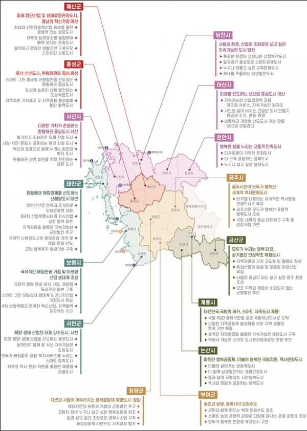 공간적으로는 서해안권, 북부권, 금강권 3대 균형발전 권역과 북부스마트산업권, 충남혁신도시권, 해양신산업권, K-바이오산업권, 국방·웰빙산업권 5대 산업발전 권역 등 계획권역을 유연하게 구상함으로써 연대와 협력을 촉진하고 상생 발전을 활성화한다.