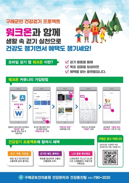 스마트폰을 이용해 모바일 걷기 앱 ‘워크온’을 설치하고‘구례군 공식 커뮤니티’에 가입하면 구례군민 누구나 챌린지에 도전할 수 있다.