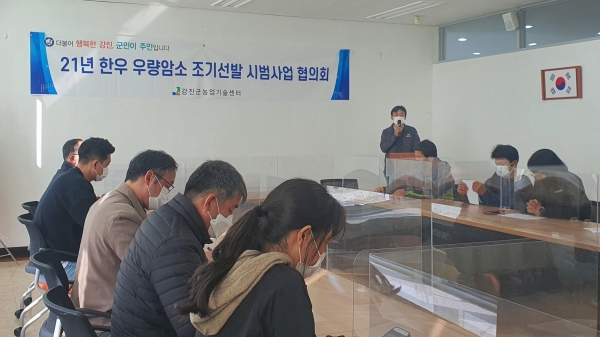 [국회의정저널] 강진군은 2021년 강진 한우 경쟁력 강화를 통해 우량 한우 조기 선발 체계 구축을 위한 단기 육종 실증사업을 추진한다 현재 대부분의 한우 개량은 씨수소 정액으로 계획 교배해 후대검정을 통한 육종에 의존하고 있지만, 우량 암소 선발까지 5년 정도 시간이 소요되고 부계 정보에 의한 반쪽짜리 개량이라는 한계가 있다.