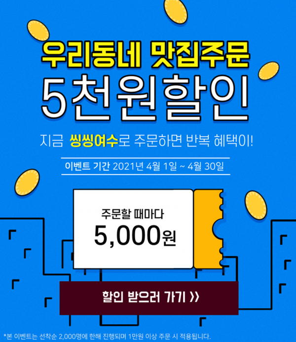 시에 따르면 4월 1일부터 한 달간 공공배달앱 ‘씽씽여수’로 주문하는 선착순 2,000명에게 주문 시 5천 원 할인 이벤트를 실시한다.