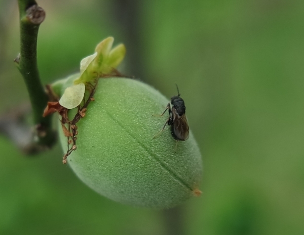 복숭아씨살이좀벌은 유과기에 씨앗 속에 알을 낳는데 피해를 받은 과실은 수확 전에 썩기 시작해 심한 경우 90% 이상 낙과한다.