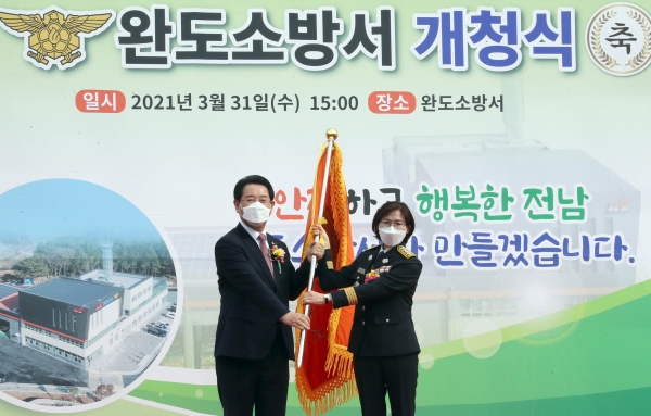 김영록 도지사는 개청식에서 “섬 지역 특성과 인구 고령화로 소방수요가 계속 늘고 있는 시기에 소방서가 문을 열어 대단히 든든하다”며 “완도소방서가 군민의 두터운 신뢰를 받는 믿음직한 안전 지킴이가 돼주길 바란다”고 당부했다.
