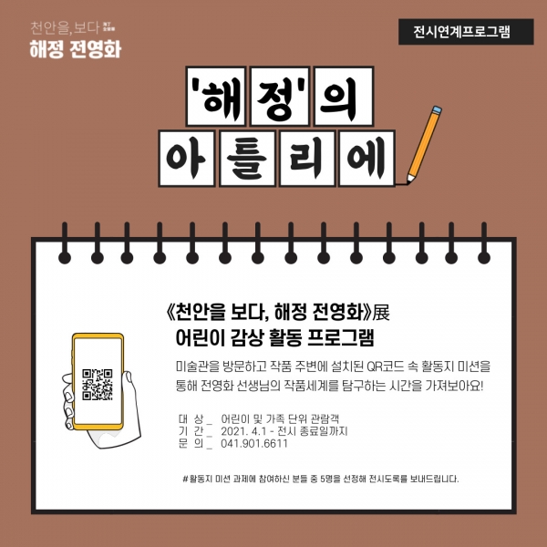 [국회의정저널] 천안문화재단 천안시립미술관이 4월 1일부터 18일까지 ‘천안을, 보다 해정 전영화’ 특별전과 연계한 어린이 대상 비대면 감상프로그램 ‘해정의 아틀리에’를 운영한다.