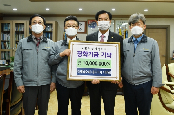 이날 행사에 앞서 경산시 인재양성을 위해 경산시장학회에 장학금 1천만원을 기탁한 ㈜새남소재 이무섭 대표는 영업이익을 지역사회에 환원한다는 소신으로 초록우산 어린이재단 및 탈북민 지원 등 각종 사회단체 지원으로 사회적 책임실천에 앞장서고 있다.