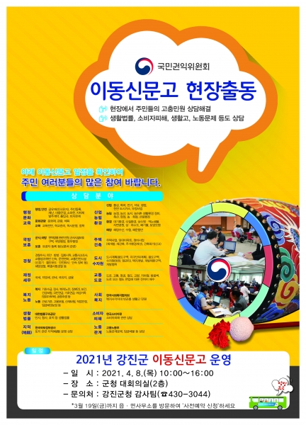 [국회의정저널] 강진군은 오는 4월 8일 강진군청 2층 대회의실에서 국무총리실 소속인 국민권익위원회 주관으로 ‘2021년 강진군 이동신문고’를 운영한다.