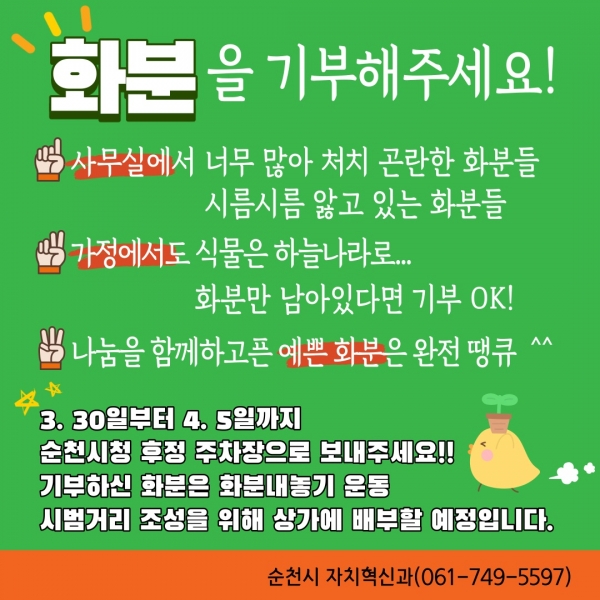 오는 4월 5일까지 화분을 수거하고 있으며 사무실이나 가정에서 관리하기 힘들어 처치 곤란한 화분, 식물이 고사해 흙만 남아있는 등 어떠한 화분도 가능하며 관심 있는 시민 누구나 헌 화분을 순천시청 입구로 가져오면 된다.