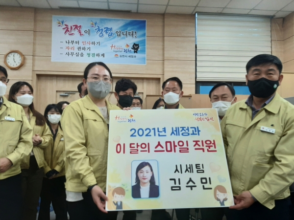 [국회의정저널] 김천시 세정과에서는 “친절”을 공직자의 가장 큰 덕목으로 삼고 친절이 최선의 행정서비스이며 시민을 행복하게 하는 첫걸음으로 생각하고 직원 모두가 친절할 수 있는 계기가 되고자 “이 달의 스마일 직원”을 선정·격려하기로 계획하고 3월 스마일 직원으로 세정과 시세팀에 근무하는 김수민 직원을 선정하고 격려했다.