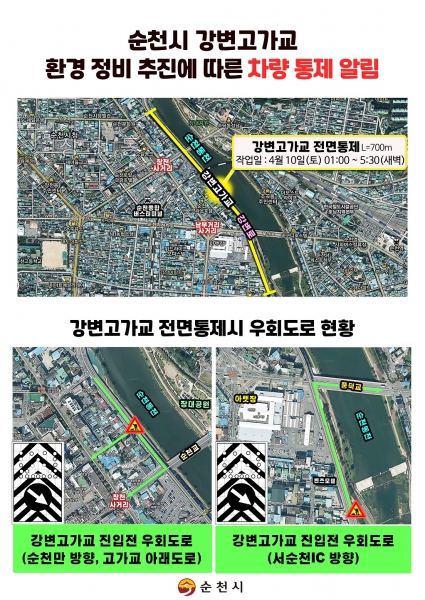 [국회의정저널]순천시는 오는 4월 10일 새벽시간 동안 강변고가교 환경 정비를 위해 전면 교통통제를 실시한다.