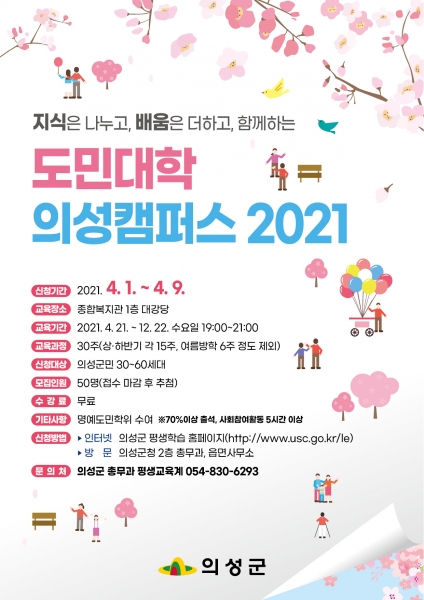 [국회의정저널] 의성군이 지난 4월 1일부터 오는 4월 9일까지 2021년 도민대학 의성캠퍼스 수강생을 모집한다.