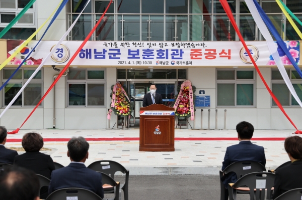 1일 열린 해남군보훈회관 준공식은 명현관 해남군수를 비롯한 윤재갑 국회의원, 김병덕 군의회의장과 군의원, 광주지방보훈청장, 도의원, 보훈단체 회장 등 내빈 50여명이 참석한 가운데 방역지침을 준수하며 진행됐다.