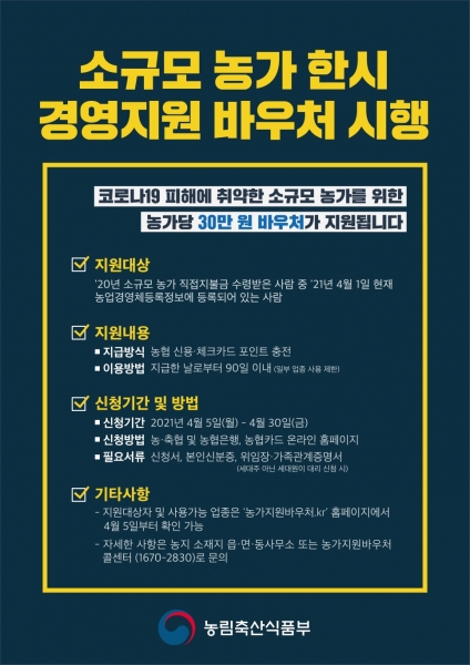 바우처 지급 대상자는 지난해 소농직불금을 수령한 농가로 4월 1일 현재 농업경영체등록정보에 등록돼 있는 자가 이달 30일까지 농지소재지 읍·면 농·축협과 품목조합, 농협은행을 직접 방문하거나 농협카드사 홈페이지에서 신청하면 된다.