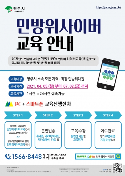 [국회의정저널] 경북 영주시는 5일부터 7월 2일까지 ‘코로나19’ 확산 예방을 위해 2021년도 민방위 교육을 사이버 교육으로 실시한다.