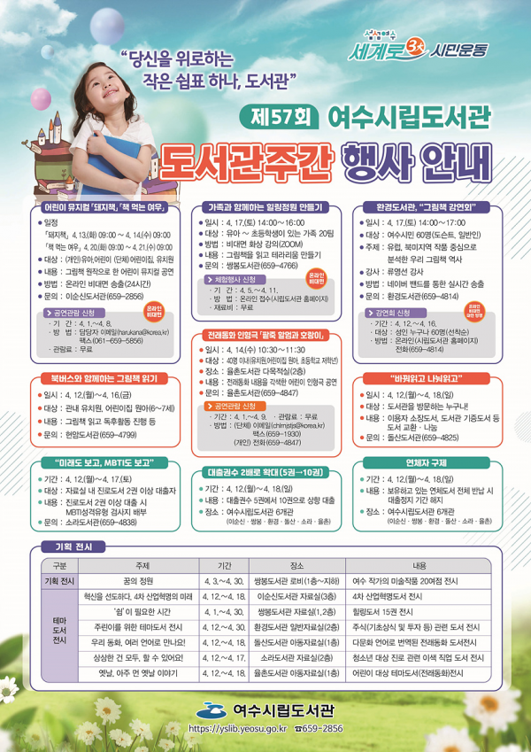 [국회의정저널] 여수시는 오는 12일부터 21일까지 여수시립도서관 7개관에서 제57회 도서관주간 행사를 개최한다.