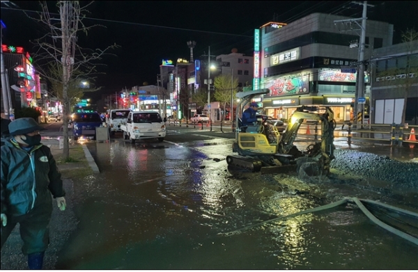시는 누수 사고 신고를 접수하고 대행업체 2곳과 굴삭기 3대, 대형양수기 2개, 작업 인력 20명 등을 동원, 왕복6차로를 부분 통제하고 긴급 복구작업을 시행했으나, 직경 600㎜ 상수도관에서 흘러나오는 누수량이 너무 많아 누수관 확인조차 어려워 단수 공사가 불가피한 실정이다.