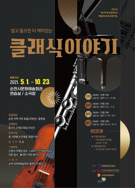 순천시 관계자는 “이번 공모로 선정된 사업을 통해 취약계층을 포함한 지역 청소년들에게 클래식에 대한 교육, 체험, 감상 등 다양한 프로그램을 제공해 문화 불균형 해소와 함께 사회성 증진, 자존감 향상 및 정서불안 해소를 도왔으면 한다”고 말했다.