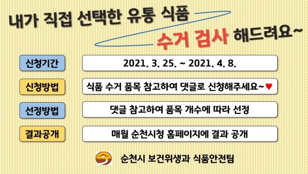 지역 내 유통되는 식품에 관심이 있거나 안전성 검사를 희망하는 품목이 있는 경우에는 매월 초 순천시 공식밴드에 ‘희망하는 유통식품 수거’에 댓글을 달아 추천하면 된다.
