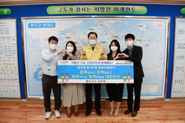 [국회의정저널] 신우철 완도군수는 6일 올해 출산 예정인 신혼부부 두 쌍과 함께 ‘저출산 극복 함께해요 범국민 포함 릴레이 챌린지’에 참여했다.