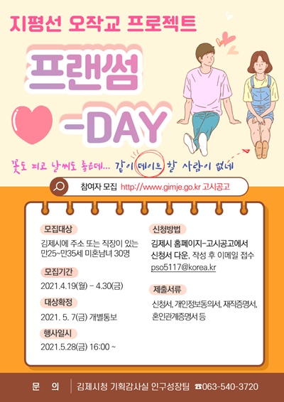 [국회의정저널] 김제시는 지역 내 미혼남녀에게 참신한 교제의 장을 마련해 결혼에 대한 긍정적인 가치관 형성과 범사회 결혼·출산문화 확산을 위해 4월 19일부터 4월 30일까지 지평선오작교 프로젝트 프랜썸-DAY 참가자를 모집한다고 밝혔다.