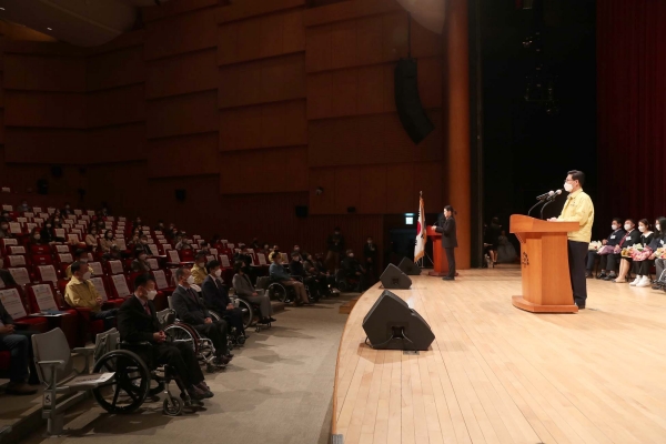 양승조 충남지사는 기념사를 통해 “더불어 잘사는 충남 구현을 통해 장애인에 대한 차별과 편견을 극복, 양극화 해소에 최선의 노력을 다할 것”이라며 “도는 코로나19의 종식을 위해 더욱 노력하겠으며 내년 제42회 장애인의 날 기념식은 코로나 감염 걱정 없는 환경에서 개최되기를 희망한다”고 말했다.