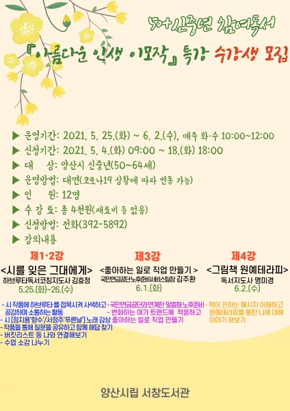 [국회의정저널] 양산시립 서창도서관은 신중년을 대상으로 ‘아름다운 인생 이모작’ 특강을 운영한다.