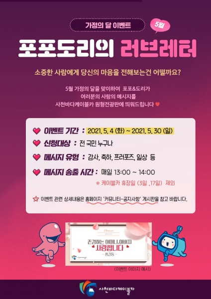 사천시시설관리공단은 5월 가정의 달을 맞아 시민과 관광객들이 함께 즐길 수 있는 ‘포포&도리의 러브레터’ 이벤트를 실시한다고 26일 밝혔다.