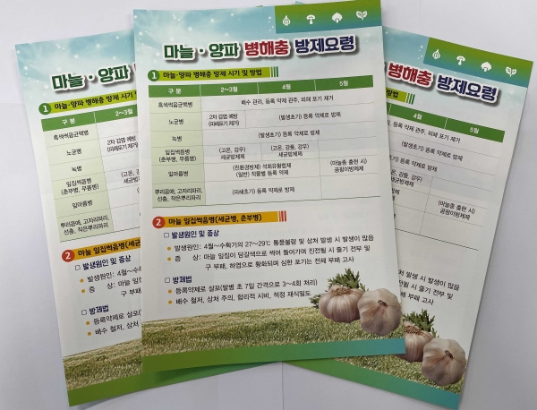 또한 고품질의 마늘·양파를 생산하기 위해서는 병해충 적기 방제가 중요한데 특히 마늘 잎마름병과 녹병, 양파 노균병을 중심으로 적용약제를 일주일간격으로 살포하고 약제 선택 시 서로 다른 계통의 약제를 번갈아 가면서 사용해야 한다.