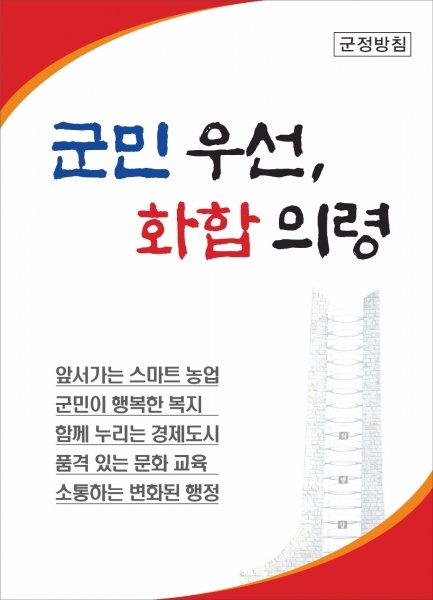 군은 새로 확정된 군정목표와 방침 문구를 디자인해 읍·면과 소속 기관 청사의 현판, 사무실 액자, 각종 공공시설물 등에 활용해 군민에게 친근하게 다가가도록 할 계획이라고 밝혔다.
