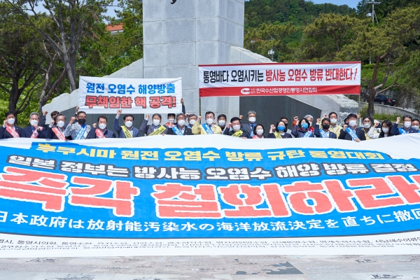 한국자율관리어업통영시연합회 회장 김종찬 회장은 규탄사에서 “어자원 고갈과 소비위축으로 이중고를 겪고 있는 어업인들에게 원전 오염수 방류는 생존권을 박탈하는 침략행위나 마찬가지”며 “어업인들이 한목소리로 단결해서 우리정부와 일본정부에 해상방류 계획 전면 철회를 강력하게 요구한다”고 목소리를 높였다.