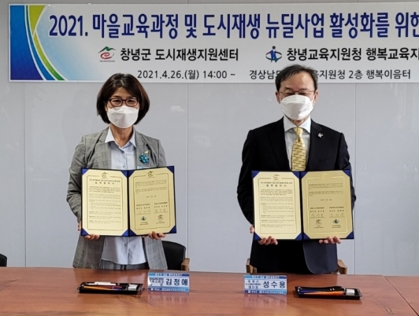 [국회의정저널] 창녕군은 지난 26일 창녕교육지원청 행복이음터에서 창녕군 도시재생지원센터와 창녕행복교육지원센터간 ‘도시재생 및 마을교육 활성화를 위한 업무협약’을 체결했다고 밝혔다.