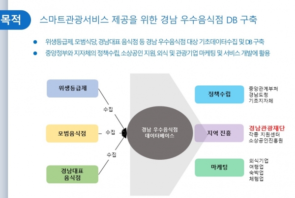 ‘스마트관광서비스 제공을 위한 경남 우수음식점 DB 구축 사업’은 경남 음식관광 수용태세 개선 및 만족도 제고를 위해 도내 위생등급제 음식점 및 모범음식점을 중심으로 메뉴, 가격, 소비자 평가 등의 데이터를 구축한다.