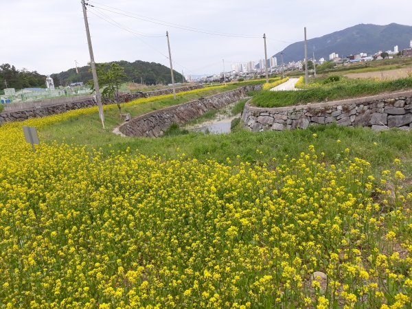 [국회의정저널] 각종 불법쓰레기 투기로 몸살을 앓았던 사천시 향촌동 봉남천변에 유채꽃이 만개해 봄 인사를 건네고 있다.